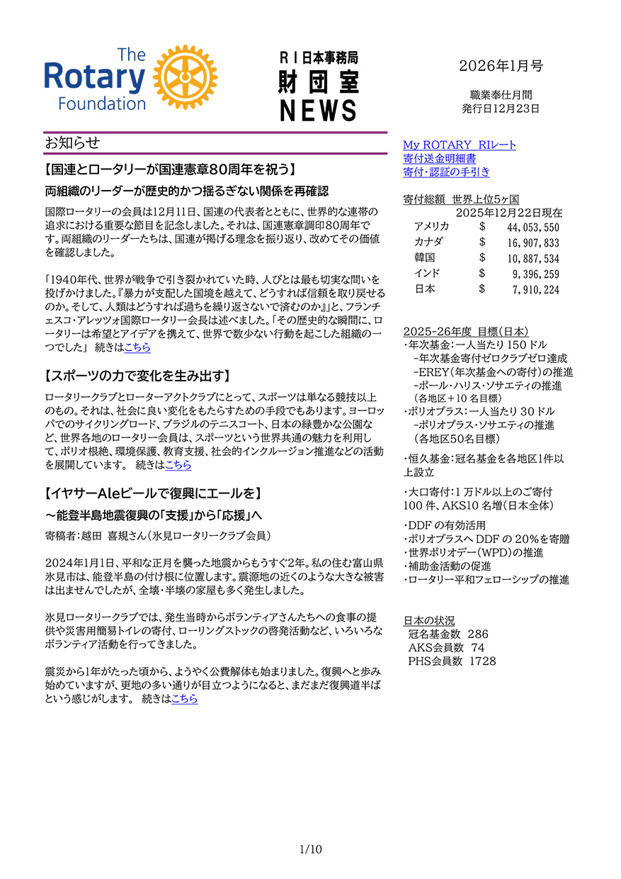 財団室ニュース 2026年1月号を掲載しました。下記画像をクリックすると、PDFファイルをご覧いただけます。